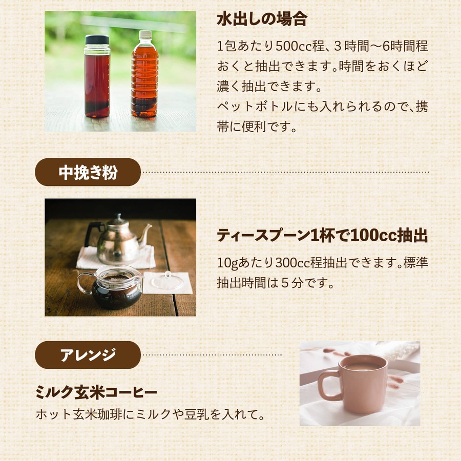 のぶしな玄米珈琲は、ライフスタイルやお好みに合わせて、さまざまな方法で楽しめます。下記の方法を参考に、あなたにぴったりの淹れ方を見つけてください。