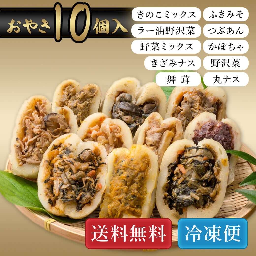 【冷凍】善光寺おやき 10個入(野沢菜・きざみ茄子 各2個・つぶあん・かぼちゃ・きのこミックス・野菜ミックス・舞茸・ラー油野沢 各1個)