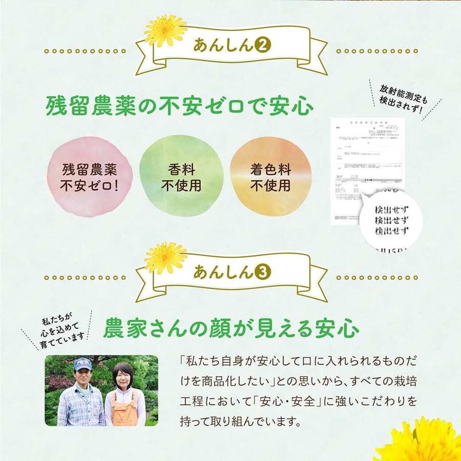残留農薬の心配がなく、香料・着色料も一切不使用。放射能検査もしっかり行い「検出ゼロ」の安全性が確認されています。